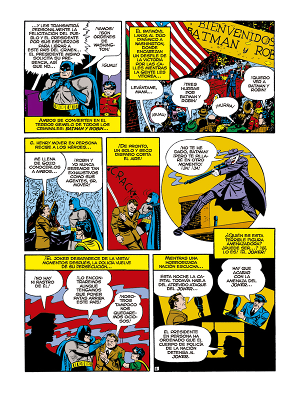 La mayor parte de las historias fueron publicadas en los años 40, en plena edad de oro de los cómics, y muchas de las que se incluyen suponen la primera aparición de los antagonistas del Murciélago, por lo que debemos acercarnos a ellas con el filtro del tiempo, y la ingenuidad con la que estos tebeos eran escritos, dirigidos en casi todos los casos a un público infantil. Comenzamos, como no podía ser de otra forma, con el Joker, del que se recoge el octavo número de Batman y que, con el tiempo y por derecho propio, acabaría convertido en el principal villano del Hombre Murciélago.