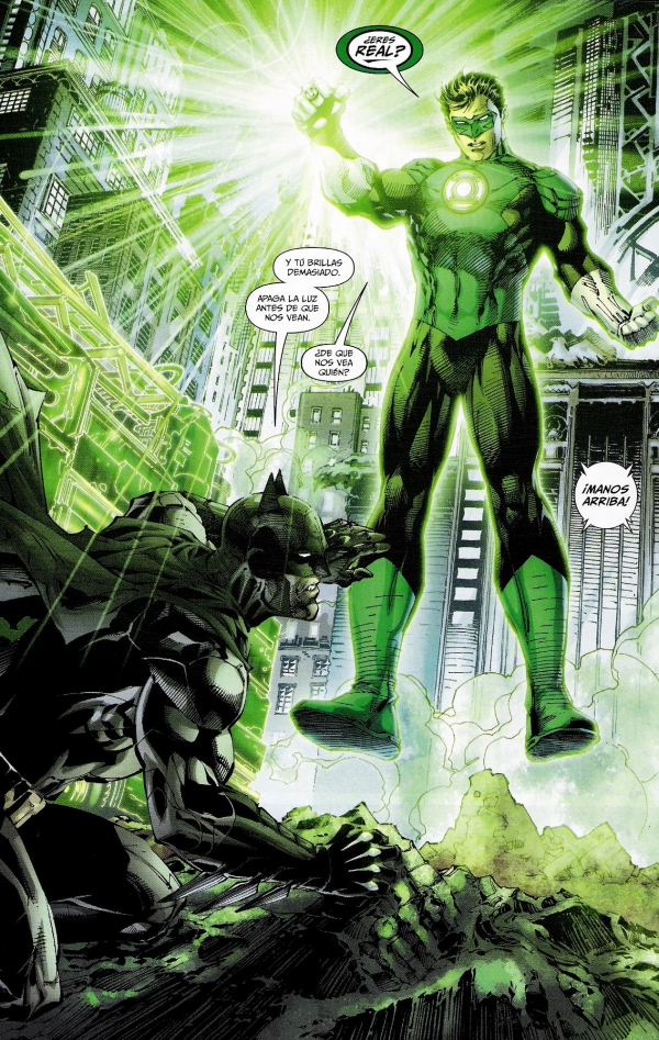 Por otro lado, una batalla no sería lo suficientemente buena si no le añadimos un toque de grafismo espectacular, y en esto Jim Lee es un maestro. Las páginas que se dedican al enfrentamiento de Batman –y luego Lantern- con las autoridades son sencillamente una gozada. Composiciones de página arriesgadas y ágiles, con mucho movimiento y, por supuesto, donde las explosiones de una ya maltrecha Gotham City priman. No obstante, no se puede dejar de mencionar a Alex Sinclair y su paleta de colores que hará las delicias de todo el mundo.