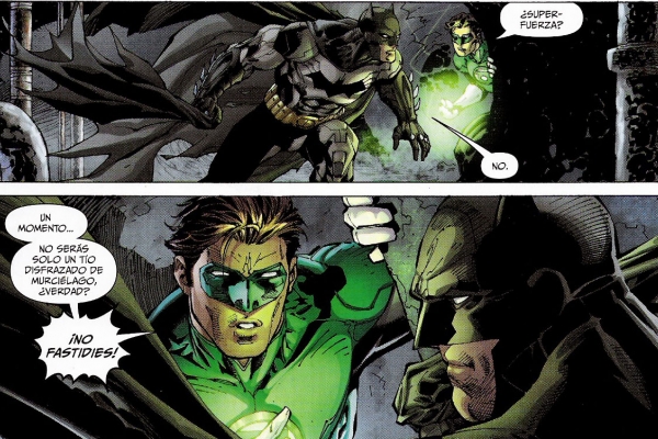 El “amo Bruce”, todos lo sabemos, es un superhéroe sin poderes –de lo que Lantern se mofará constantemente- que se centra en su inteligencia como el centro de su poder, cuya especialidad es atacar sin ser visto y deslizarse por entre los rincones oscuros como su fueran su hábitat natural. Mientras tanto, el joven y novato Hal Jordan es todo lo contrario: su especialidad es atacar por delante y apenas sin pensar, con toda la fuerza que le confiere su poder de Green Lantern. Muy diferentes, queda claro, y este hecho lo notará la pareja enseguida y derivará en varios comentarios bastante graciosos e hilarantes.