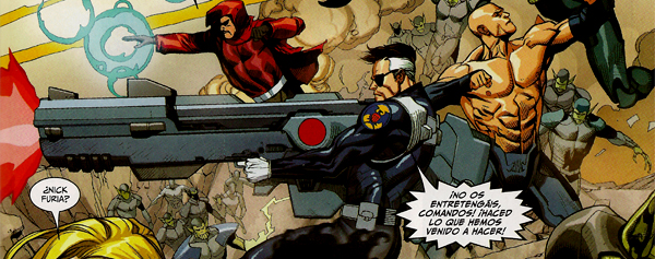 Así pues, el número se centra sobre todo en escenas de acción con las que Yu firma algunas de las mejores páginas de su carrera. En concreto destaca el espectacular zoom que comienza narrando desde el espacio la llegada de las naves skrull para luego mostrar la huida del Vigía y la llegada de Ms. Marvel a Nueva York y terminar en plena batalla de Nick Furia y sus “Guerreros Secretos” en pleno Manhattan. La planificación de cada viñeta, unida al uso que Bendis hace de la voz en off, es sin duda una maravilla. Secuencias posteriores como la reacción de un desconfiado Furia hacia Ms. Marvel ó la esperanzadora aparición final de dos de los principales personajes de la editorial son sin duda momentos que saben enganchar al lector y disfrazan que en realidad se ha contado más bien poco.